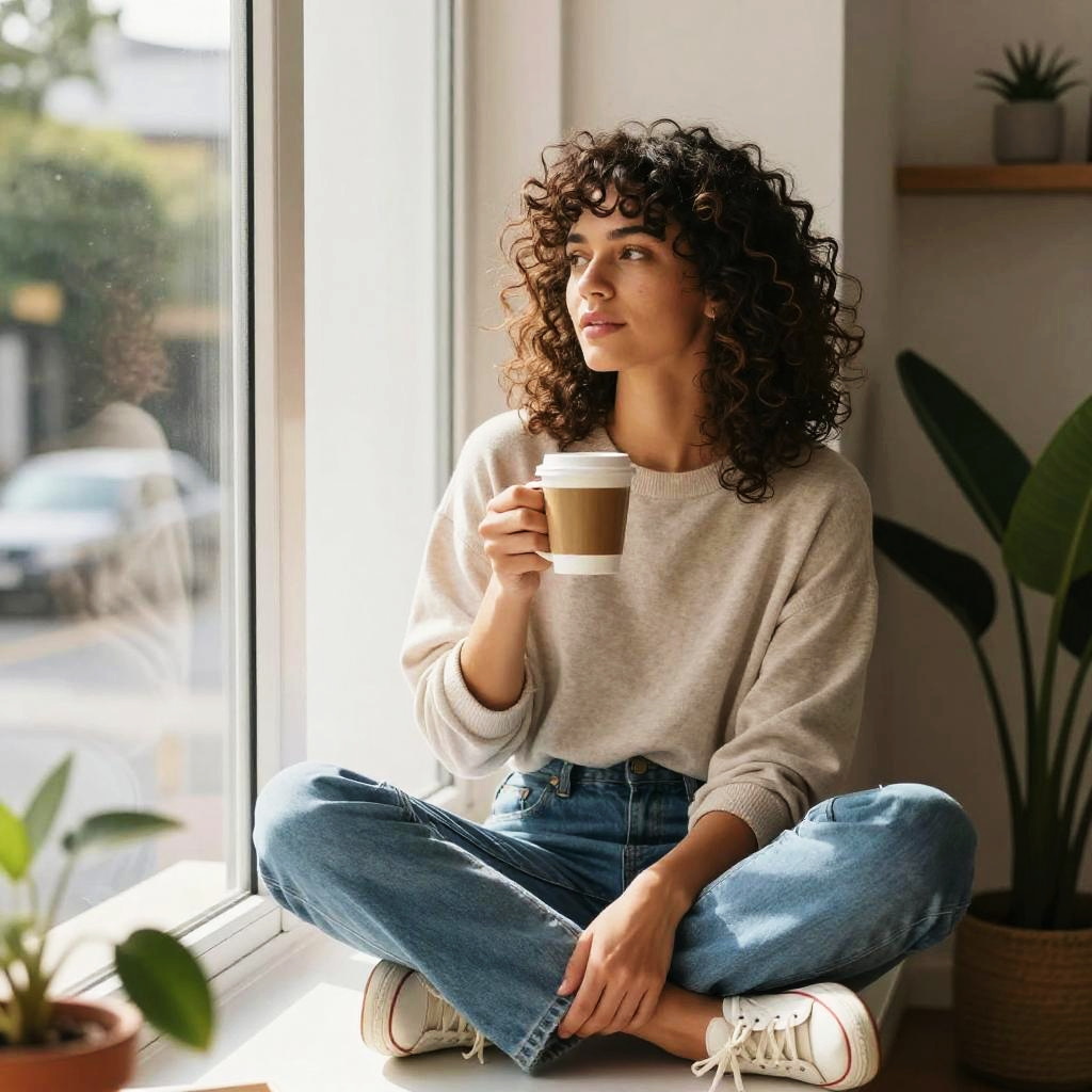 Photograph of a young woman with long brown hair, wearing a white t-shirt, high-waisted blue jeans, and white sneakers, standing against