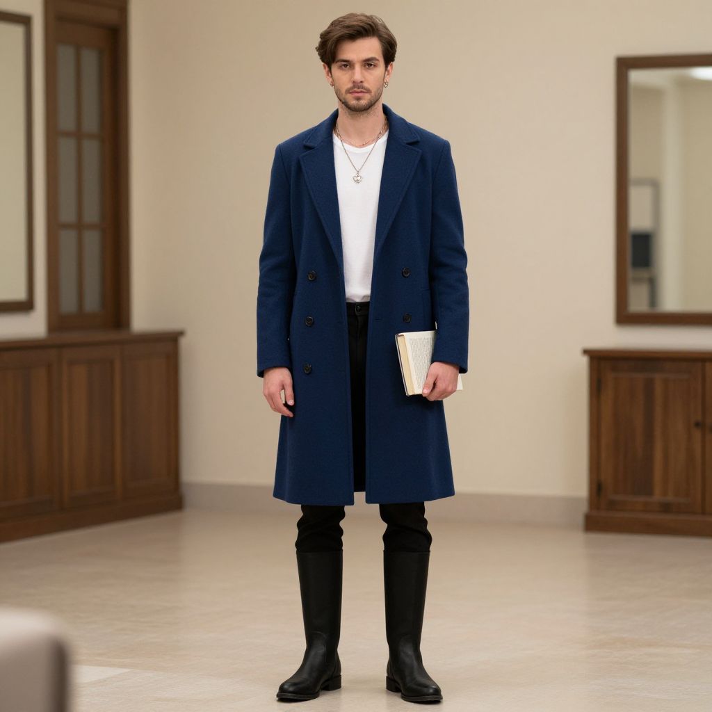 "costume romance drama, 1boy, solo, male focus, jewelry, indoors, standing, boots, looking at viewer, full body, brown hair, black footwear, facial hair, necklace, earrings, blue coat, coat, long sleeves, book, white shirt, pants Realistic photo of casual sexy person with pretty face"