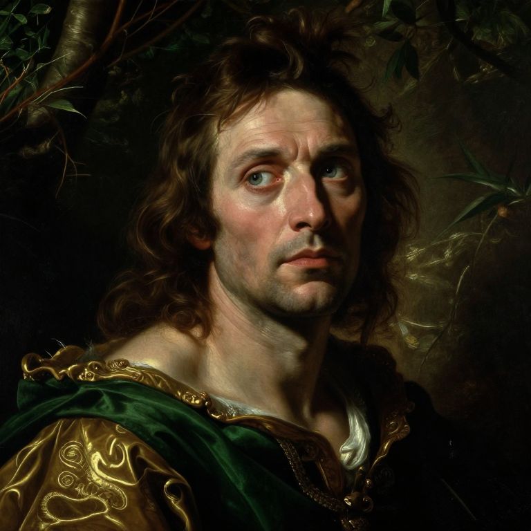 Craft an image merging hyperrealism with Baroque painting, showcasing a captivating portrait of an enigmatic wanderer whose expressive face and piercing gaze command attention. A single light source illuminates their visage, casting dramatic shadows across age-old features and emphasizing the depth and character lines on their skin. Amidst a lush, overgrown forest setting, they are cloaked in deep green and gold hues, symbolizing nature's embrace while hinting at untold tales. From a low angle, capture the intensity of this subject's presence, evoking an emotional spectrum from curiosity to intrigue as their captivating eyes seem to share secrets unseen.