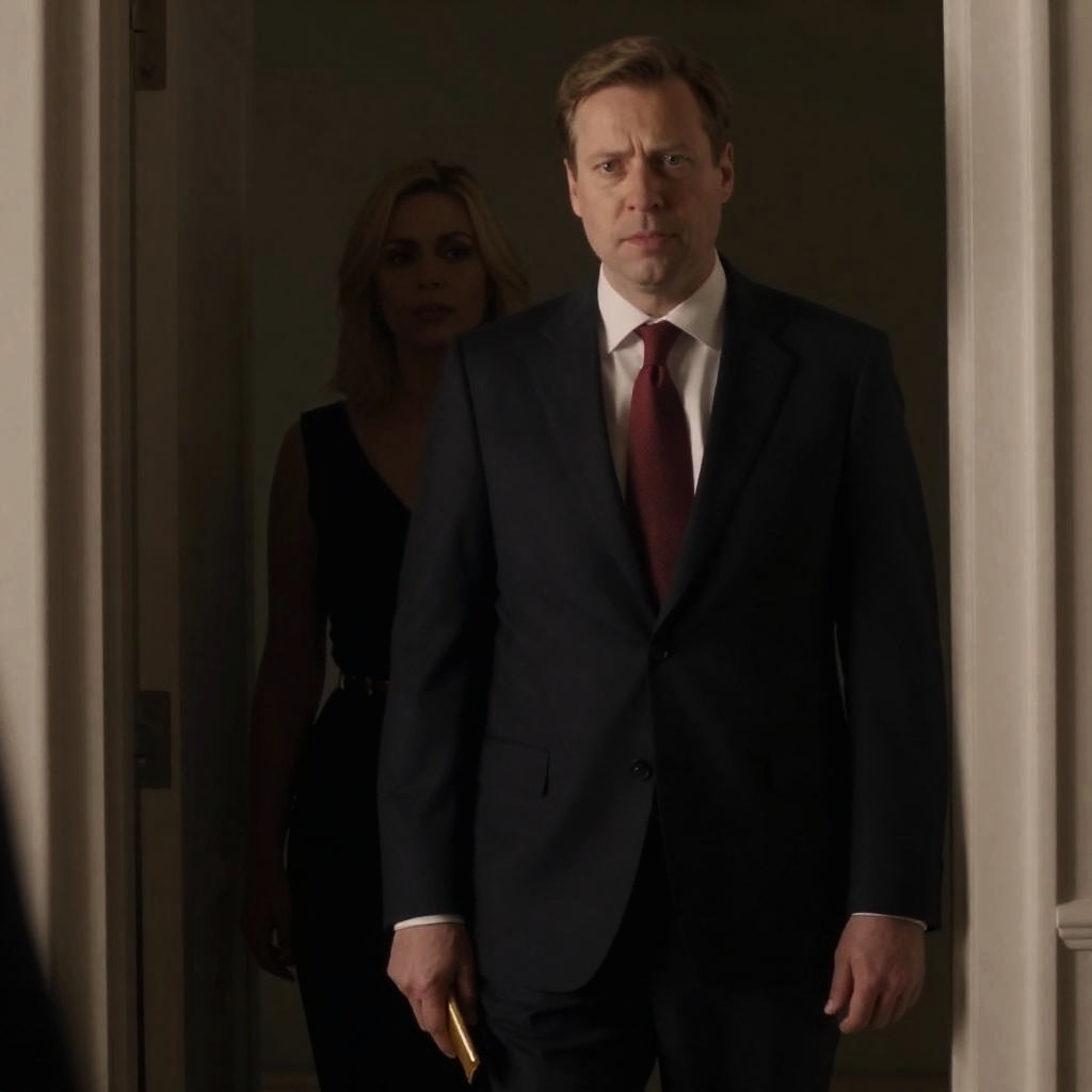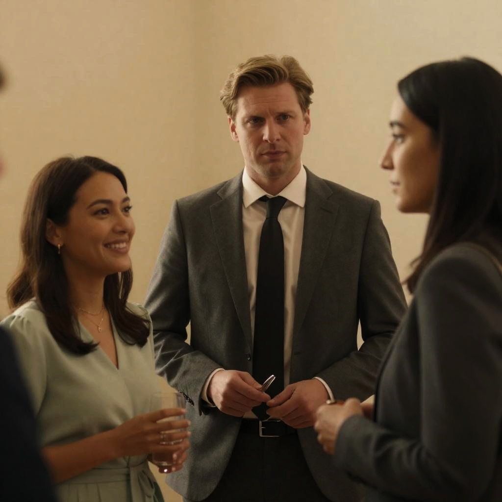 Photograph of a living room scene with four people. A man in a brown suit stands in a doorway, observing. Three women sit on a dark couch, one with blonde hair in a blue top, one with dark hair in a black top, one partially visible. Ornate gold-patterned walls, a lamp, a vase, and magazines on a table. The woman on the right has her legs crossed, wearing a black dress. The man has a neutral expression. Warm lighting.