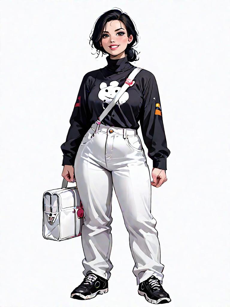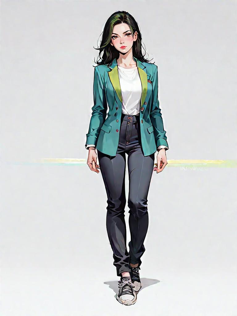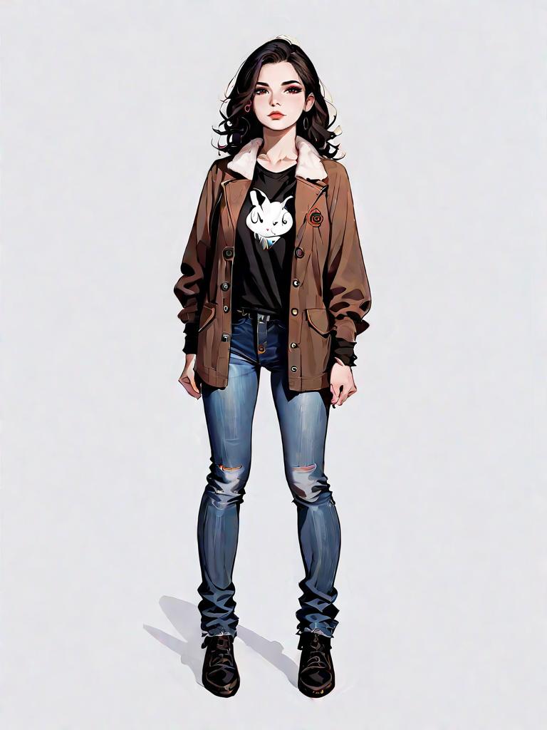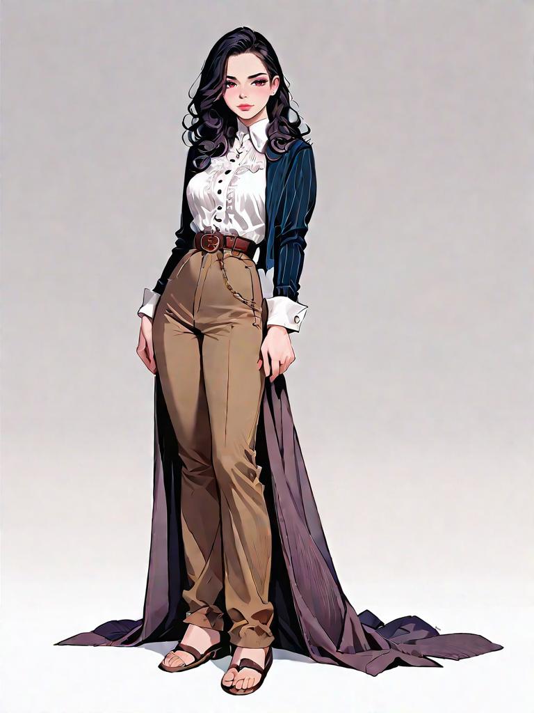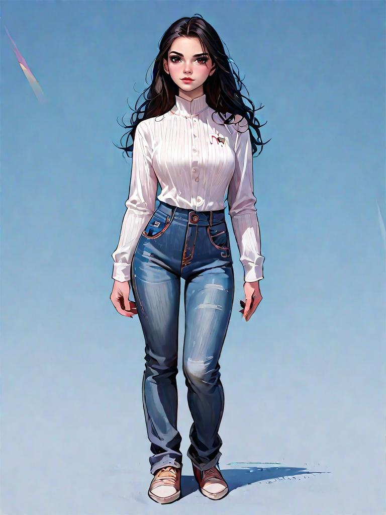 1girl, source_comics, realistic face, full body shot, Woman, casual chic, white loose-fitting blouse with tie at the neckline, long bell sleeves with lace and silver grommet details at the cuffs, distressed blue denim jeans, ankle-length with heavy tearing, tan stiletto sandals.