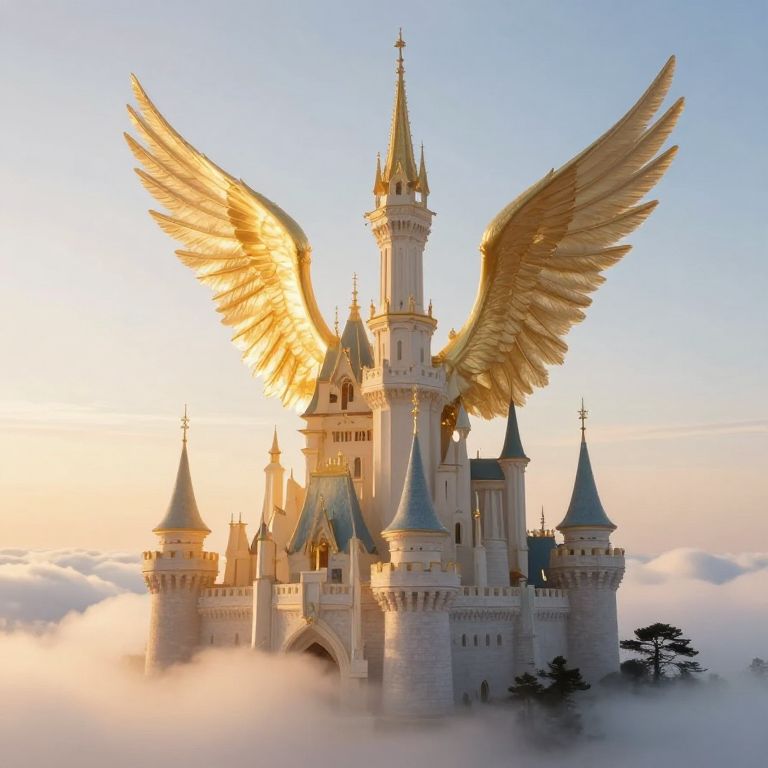An ethereal castle ascends into the heavens, its winged spires bathed in the golden glow of dawn, symbolizing the boundless pursuit of freedom and the transcendence of earthly limitations.