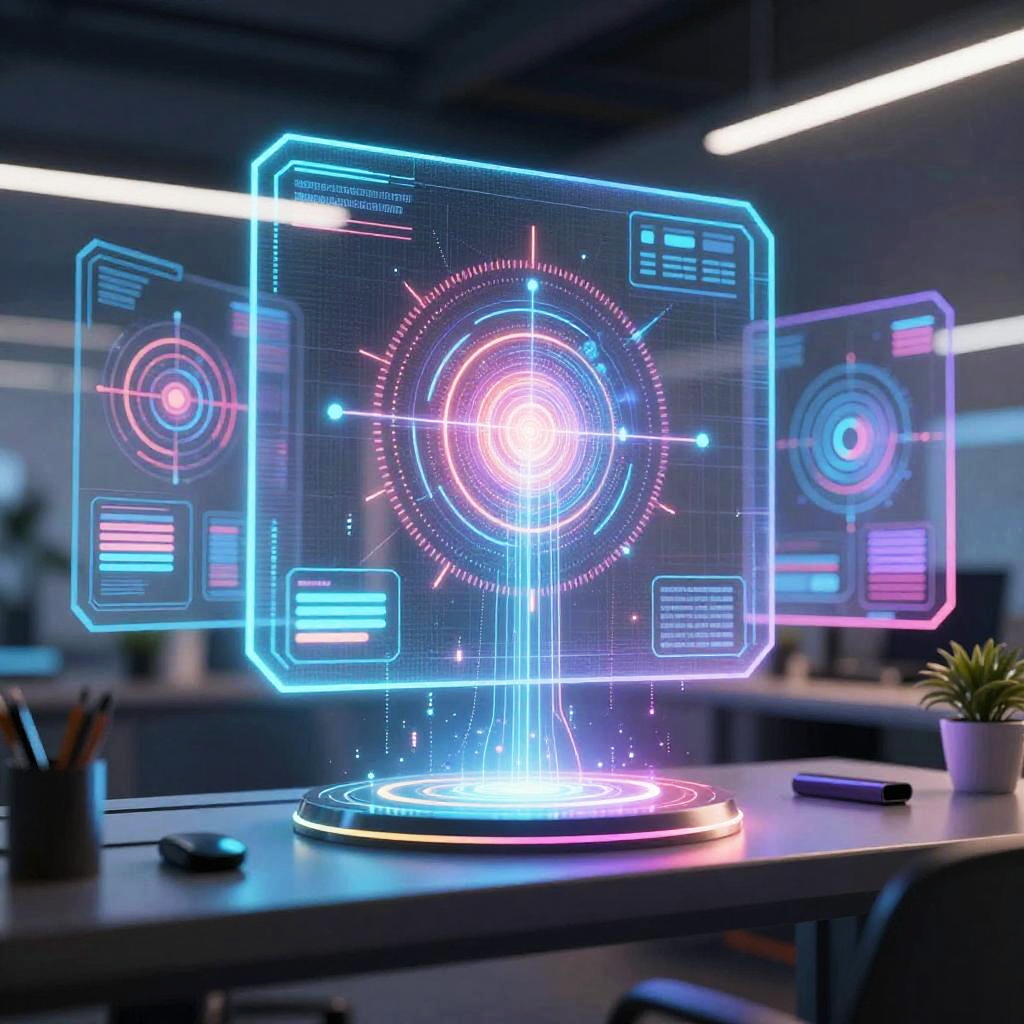 PS6 concept art showcasing a console integrated with advanced AI holograms, sleek curved surfaces with iridescent materials reflecting ambient light, set in a high-tech room filled with ambient neon glows and futuristic gaming accessories.