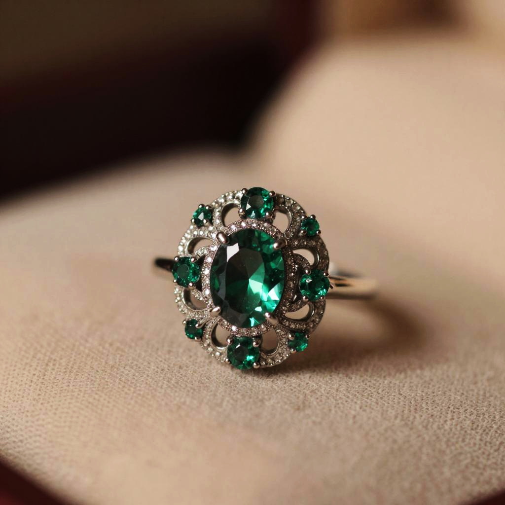 A close-up photograph of an elegant, vintage-style ring featuring a large, round, faceted green gemstone at its center. The gemstone is surrounded by a delicate, intricately designed silver band embellished with smaller green gemstones and sparkling silver details. The ring is placed on a soft, beige fabric background with a blurred, dark brown and light beige bokeh effect in the background. The lighting highlights the gemstone's vibrant green color and the silver's reflective surface, creating a luxurious and vintage aesthetic.
