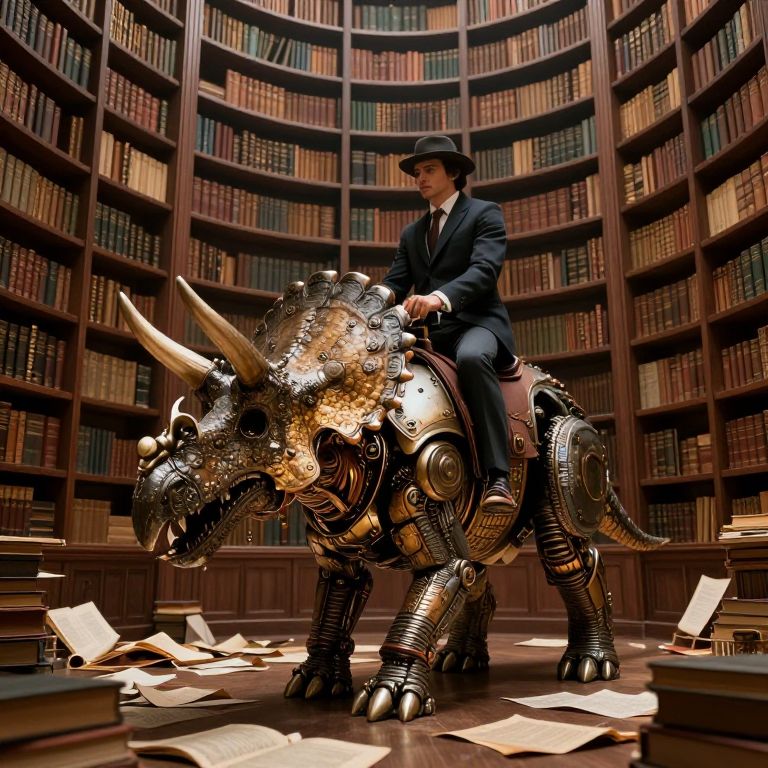A dapperly dressed figure rides a mechanical triceratops through a towering library where scattered pages carpet the floor, creating a surreal blend of ancient knowledge and steampunk wonder.
