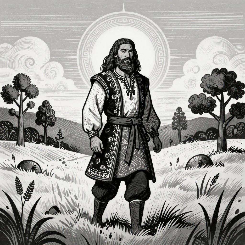 Black and white woodcut-style illustration of a wandering bard with long hair and a beard, standing in a detailed meadow landscape. The bard wears intricately patterned traditional clothing and has a contemplative expression. Background includes stylized trees, swirling clouds, and a circular design resembling a sun or halo, emphasizing textured linework and detailed patterns.