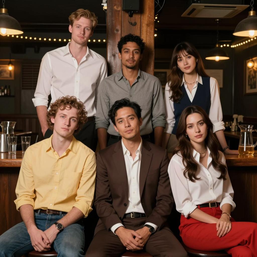 Four people in an indoor setting. Three women and one man. Woman in light-colored uniform with headband sits at counter, left. Tall woman with dark dress and scarf stands, center, holding dog. Blonde woman in fur coat sits, right, facing man in dark suit, seated, right. Background has wall sconces, patterned wallpaper, and framed pictures. Counter has papers and objects. Dog stands near standing woman. Man looks at blonde woman.