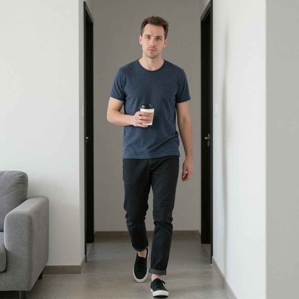 A man in his early 30s with a clean-shaven face, slightly crooked nose, and intelligent gray eyes walks confidently through a minimalist apartment hallway, holding a coffee cup, reflecting a contemporary attitude with intentional simplicity and mindful presence in a modern city living space.