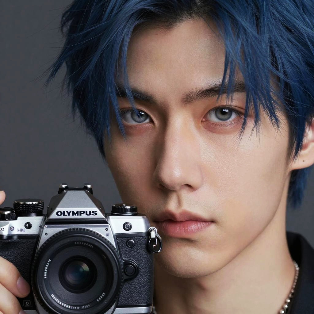 Realistic photo.Olympus OM-D E-M1 capturing a three-point perspective extreme close-up in cyberpunk. Focused on a male model with blue hair, grey eyes. realistic photo
