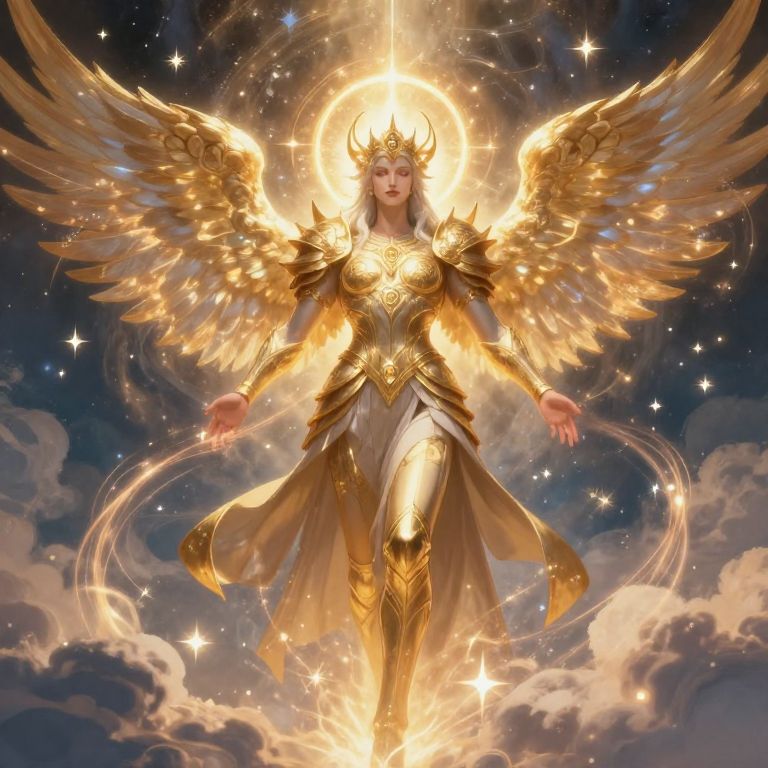 Fantasy digital painting of a god OC generator manifesting a god character with radiant halo, golden armor adorned with sacred symbols, and celestial wings spreading wide, surrounded by swirling clouds, shining stars, and divine energy currents in a dramatic composition.