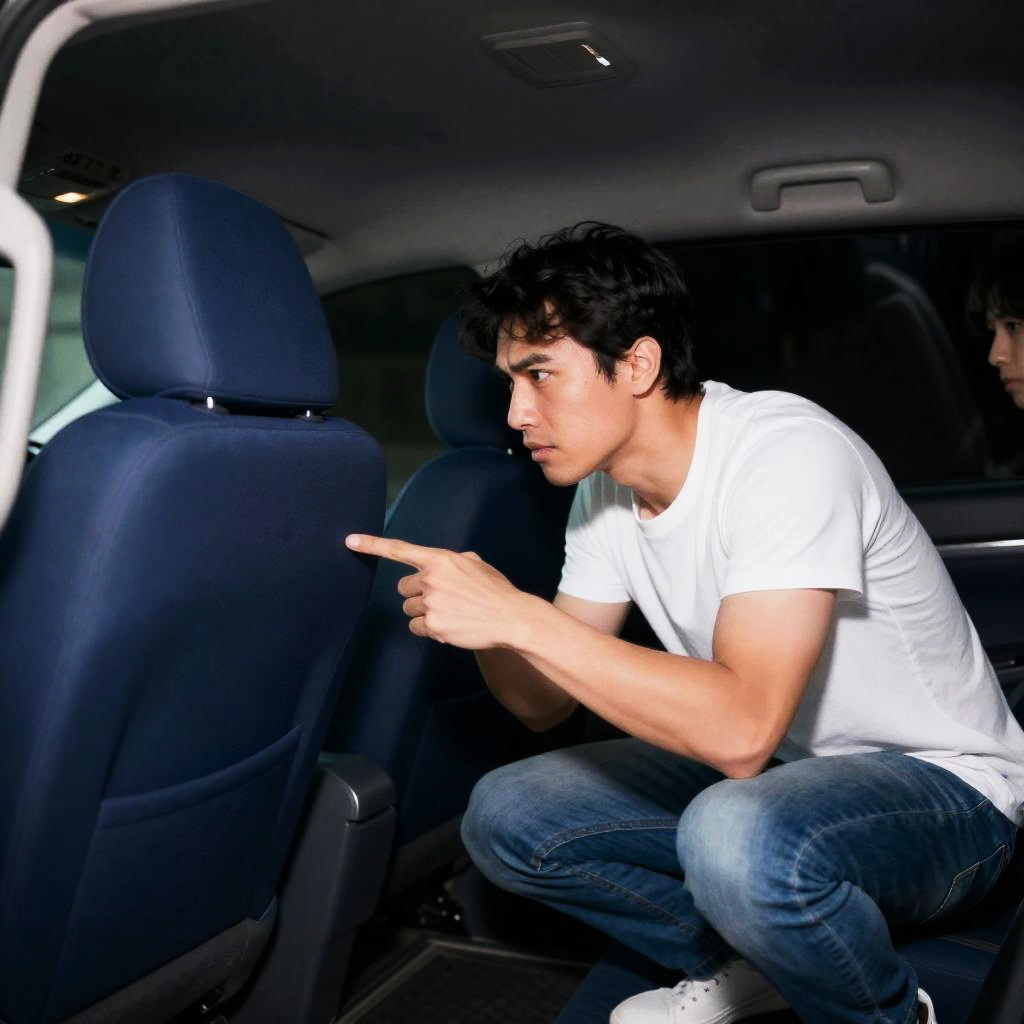Man with medium build, dark hair, white t-shirt, blue jeans, crouching in minivan, pointing at blue jacket-covered passenger seat. Intense expression. Minivan interior with seats and overhead luggage compartments. Dim lighting. Two people.