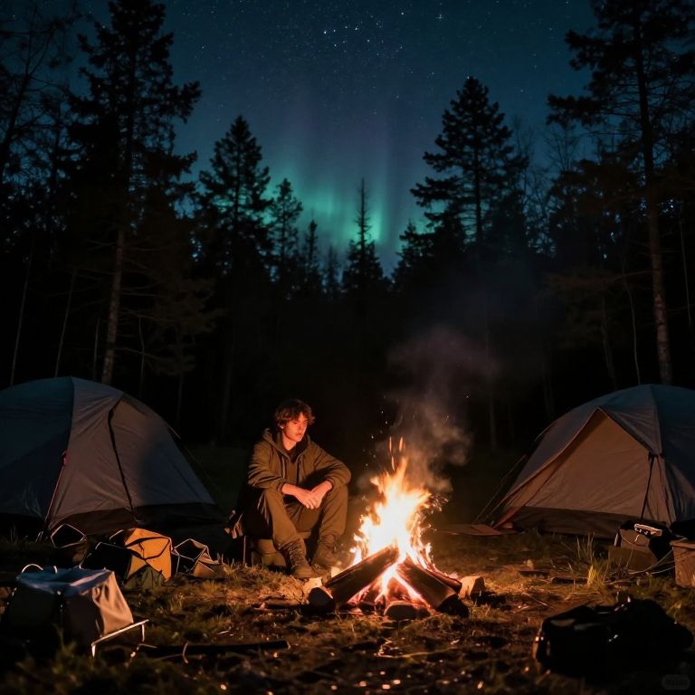 Photograph of a nighttime camping scene in a forest. A man with short dark hair, wearing a green jacket and khaki pants, sits cross-legged by a bright, orange campfire. Two dark-colored tents are set up on either side of the fire. The background features tall, silhouetted pine trees under a starry sky with a visible greenish aurora. Various camping gear, including a backpack and sleeping bag, are scattered around the fire. The ground is covered in grass and small rocks, with the fire casting a warm glow on the scene.