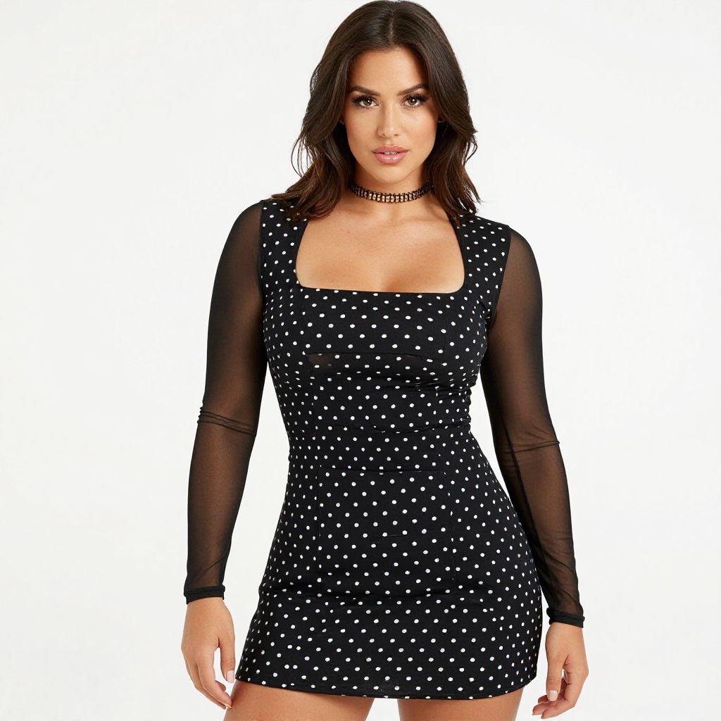 Photograph of a young woman with medium-length, dark brown hair and olive skin standing against a plain white background. She wears a form-fitting, black mini dress adorned with white polka dots and sheer black long sleeves. The dress has a square neckline that reveals her cleavage. She also wears a black choker with a metallic edge. Her expression is neutral, with slightly parted lips. The lighting is bright and even, highlighting the textures and patterns of her outfit. The overall style is modern and chic.