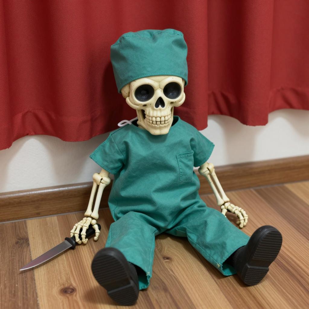 Small, grimacing skeleton figure in green medical scrubs and cap, sitting with legs spread, holding a knife in right hand, against a wall with red curtains, on wooden floor, viewed from above.