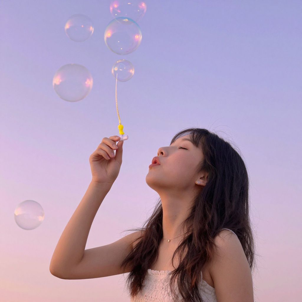 A young woman blows a vibrant stream of iridescent bubbles upward, creating a cascade of colorful reflections against a dreamy, gradient sky.