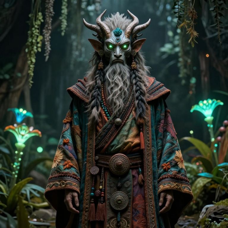 Portrait of an ancient guardian named oayche, a wise mythical figure clad in ornate robes blending nature and tribal elements, piercing eyes glowing with ancient knowledge, standing in a sacred natural sanctuary surrounded by glowing flora