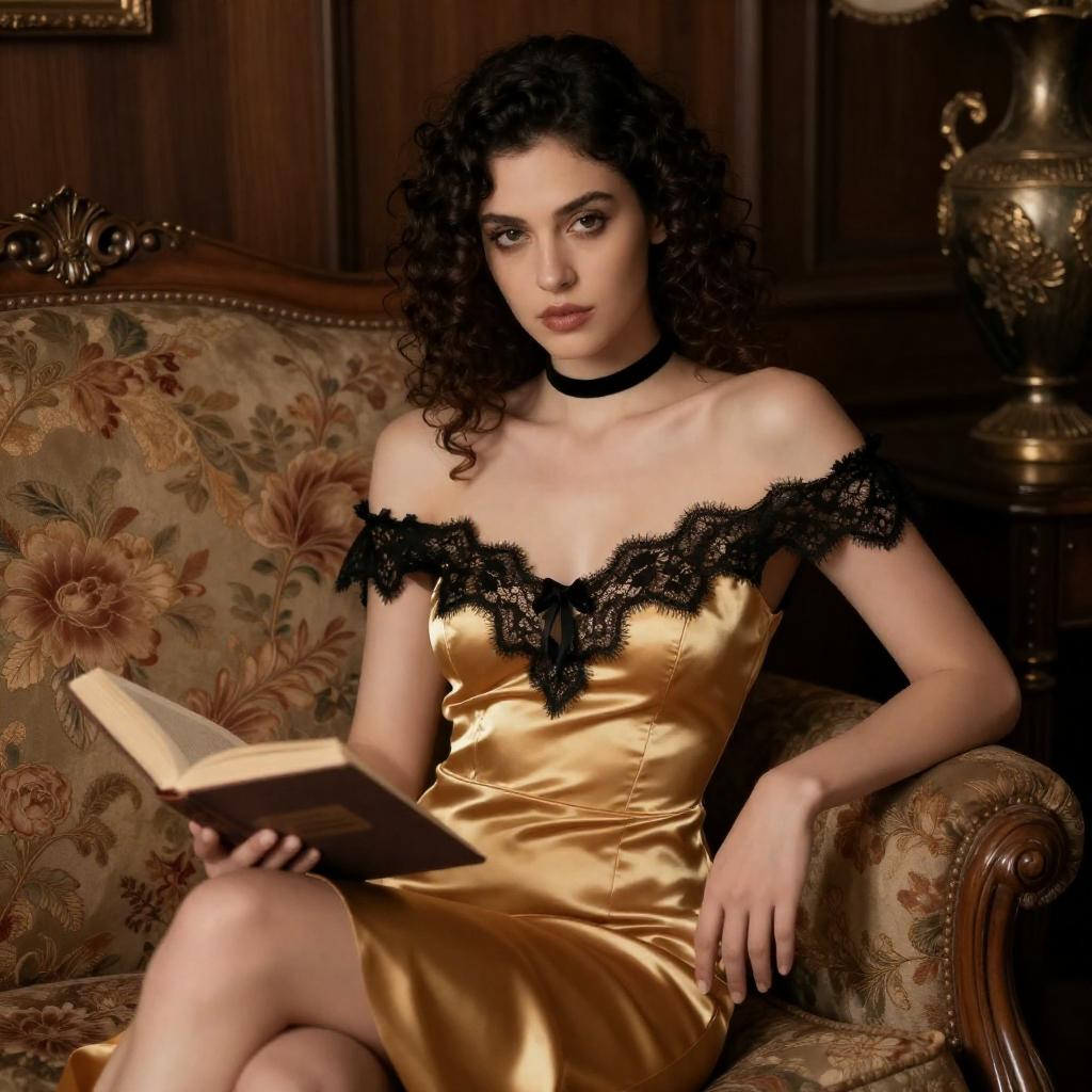 Woman with fair skin and dark, curly hair wearing an off-shoulder, gold satin dress with black lace and a black choker, sitting on an ornate, floral-patterned couch. She holds an open book in her left hand, right arm resting on the couch. Large, dark vase on the right. Dark, wooden background. Intense gaze.