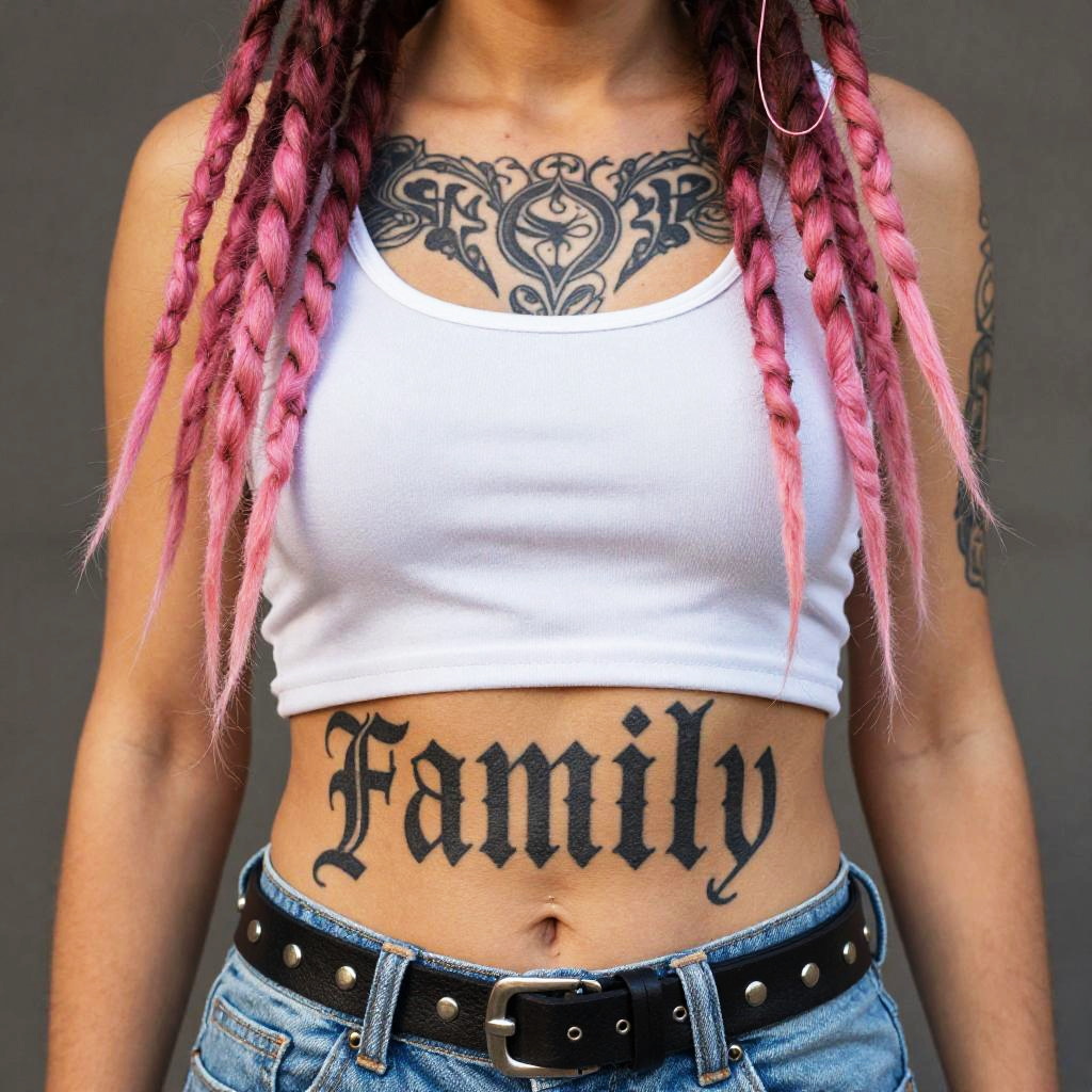 Photograph of a woman with pink and black braided hair, wearing a white, cropped tank top that reveals her midriff. She has a black, intricate tattoo across her upper chest and a bold, black "Family" tattoo in Gothic lettering on her lower abdomen. She wears blue jeans with a black, studded belt. The background is a solid, dark gray. Her skin tone is light brown, and she has a slim build. The image focuses on her torso, with her face out of the frame.