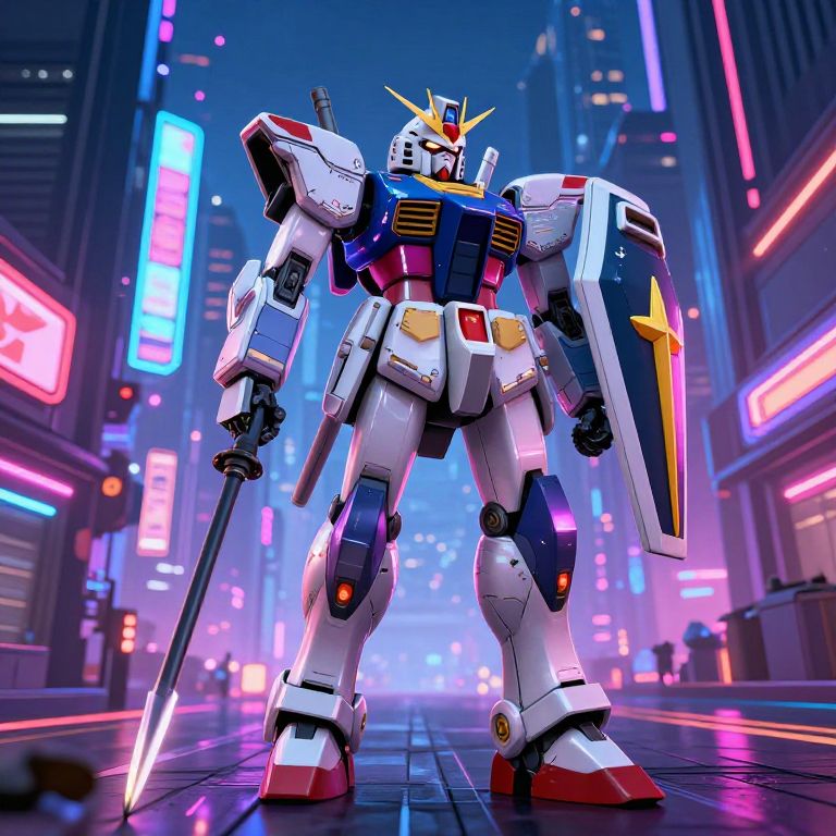 CGI image of a white, blue, and red robotic mecha with a sword and shield, standing in a neon-lit cyberpunk city street