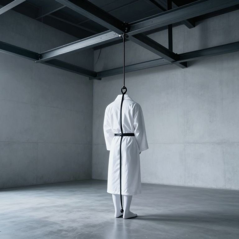 Photograph of a person in a white lab coat, standing in a dimly lit, industrial room, suspended by a black harness.