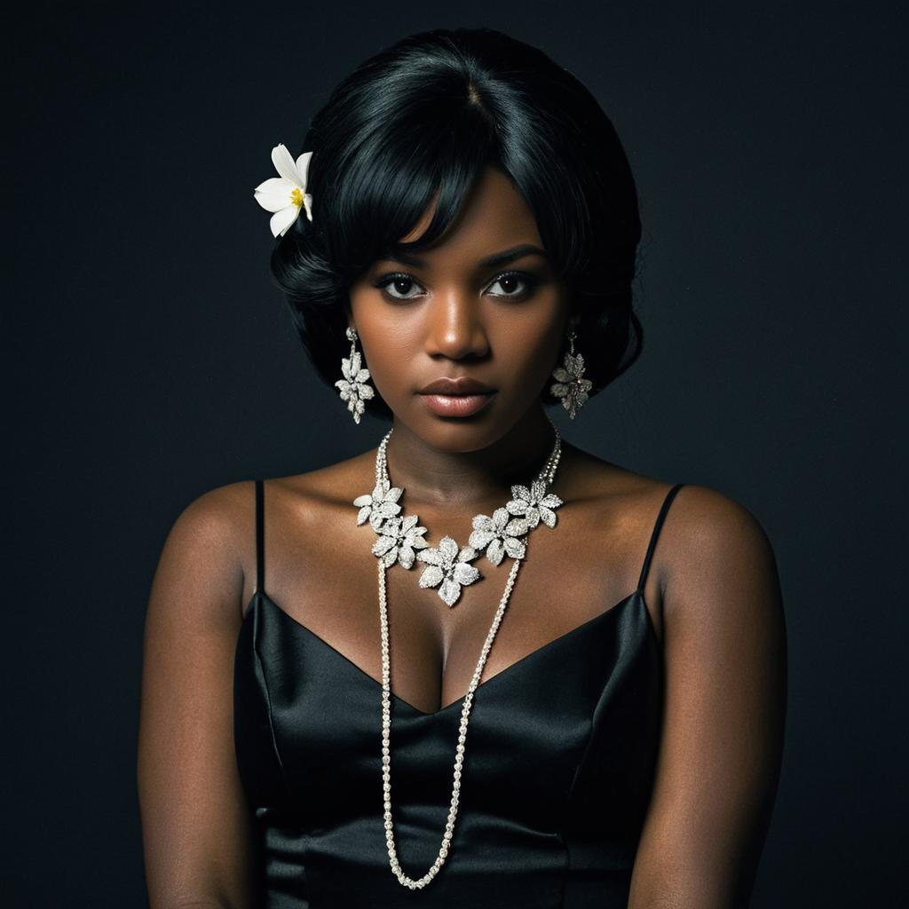Black mafia costume,1girl, solo, jewelry, earrings, black hair, dress, realistic, dark skin, necklace, flower, dark-skinned female