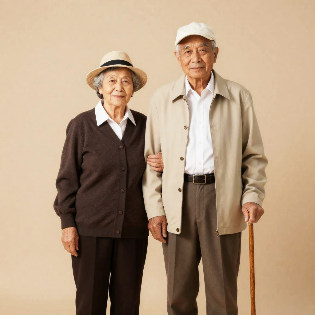 Old man with gray hair, closed eyes, smiling, wearing navy tracksuit with white stripes and beige pants, standing in front of a white and brown RV, surrounded by green trees in sunlight.