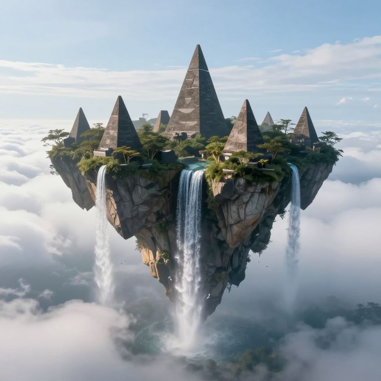 Suspended above an endless sea of clouds, a serene archipelago of inverted pyramids cradles a world of tranquility, where cascading waterfalls defy gravity, symbolizing the eternal dance between the earthly and the ethereal.