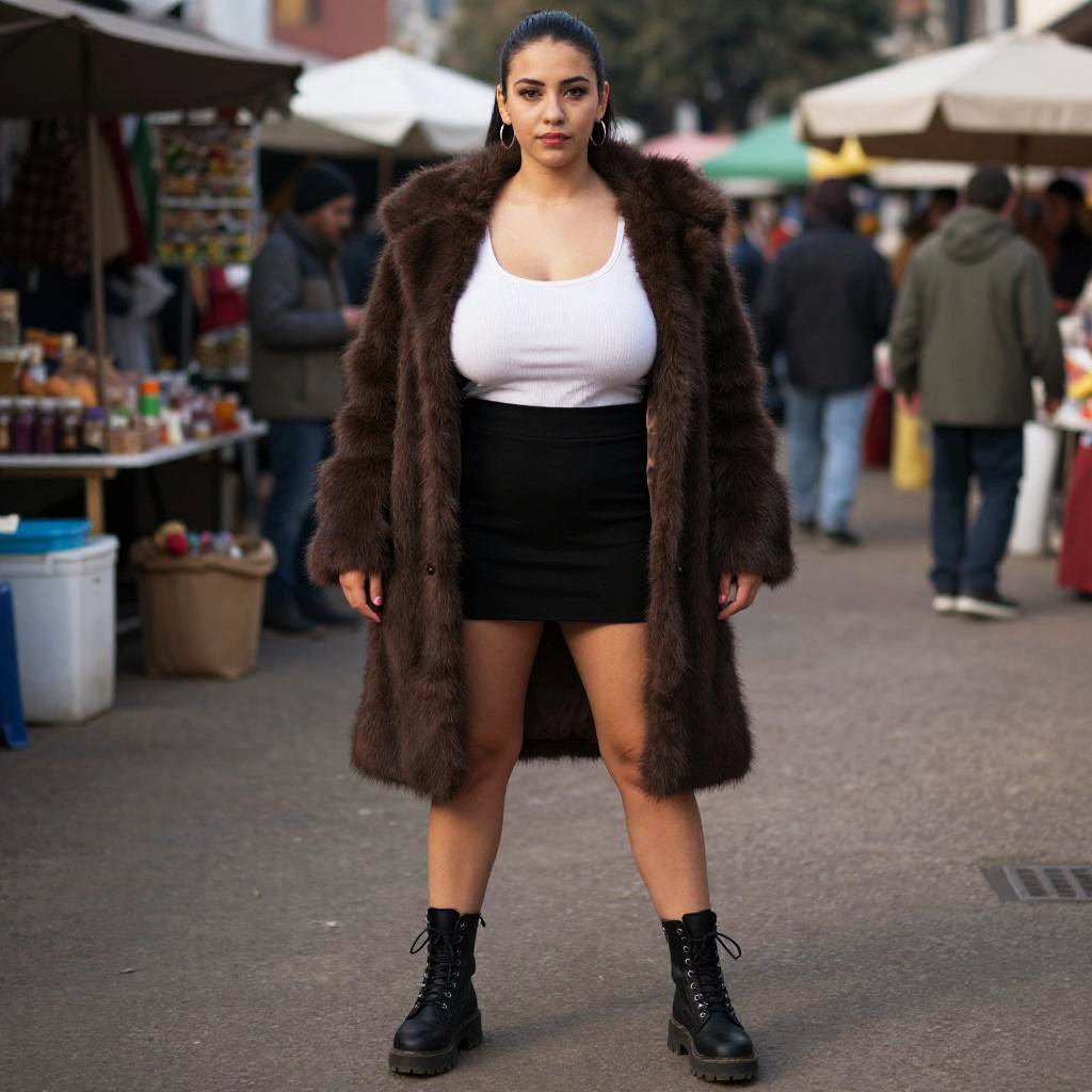 A woman, styled in eastman reversal film stock, wearing an oversized deep brown faux fur coat over a ribbed white tank top and a high-waisted black mini skirt, paired with chunky black lace-up boots. She stands at a vibrant outdoor market in a South American plaza, with her straight hair pulled back and minimalistic silver hoop earrings glinting in the sunlight. Sexy. Pretty face and beаutiful eyes. Big breasts