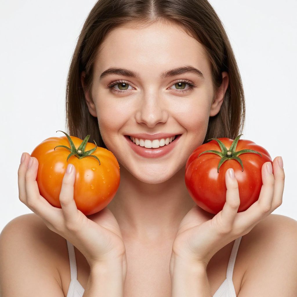 Smiling woman holding two vibrant tomatoes, one orange and one red, showcasing a healthy and cheerful demeanor.