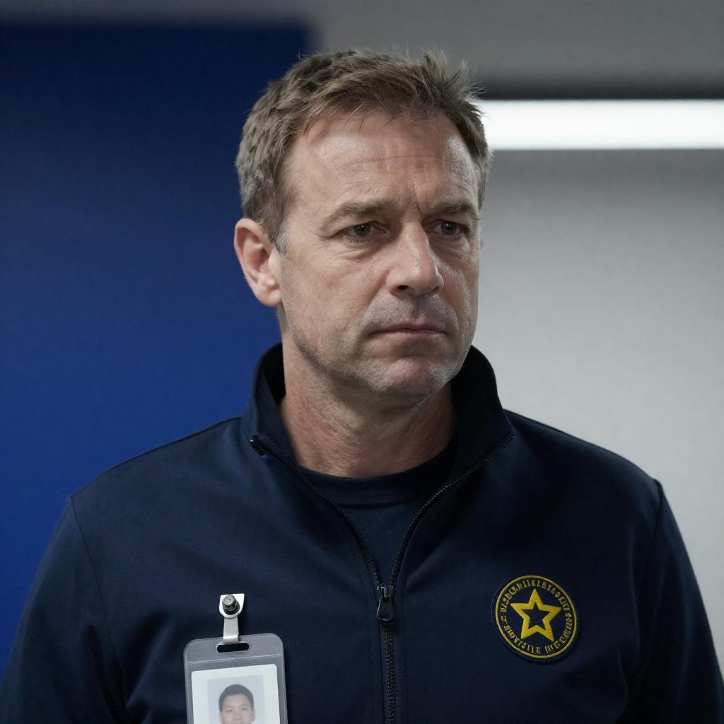 Photograph of a middle-aged man with short, light brown hair, wearing a dark blue jacket with a white ID badge and a yellow circular emblem. He has a serious expression, looking slightly to the right. The background is dimly lit with blue and white light, creating a moody atmosphere.