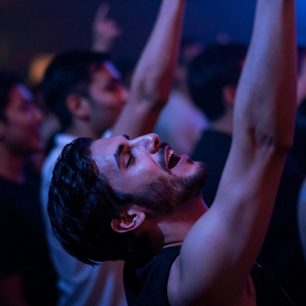 Photograph of a dynamic, blurred scene with glowing purple and blue lights. Multiple outstretched hands, illuminated by the lights, fill the center. The background is dark, enhancing the vibrant, energetic atmosphere. The hands appear to be in motion, suggesting a lively, possibly dancing crowd.