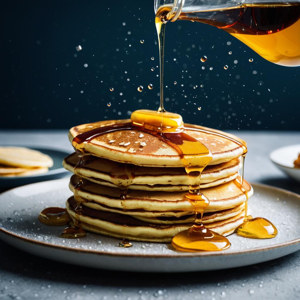 The image captures a splash of golden maple syrup on a stack of pancakes. The suspended droplets and the smooth interplay of warm and cool hues create a visually striking scene that portrays the elegant flow and contrast between the two liquids.