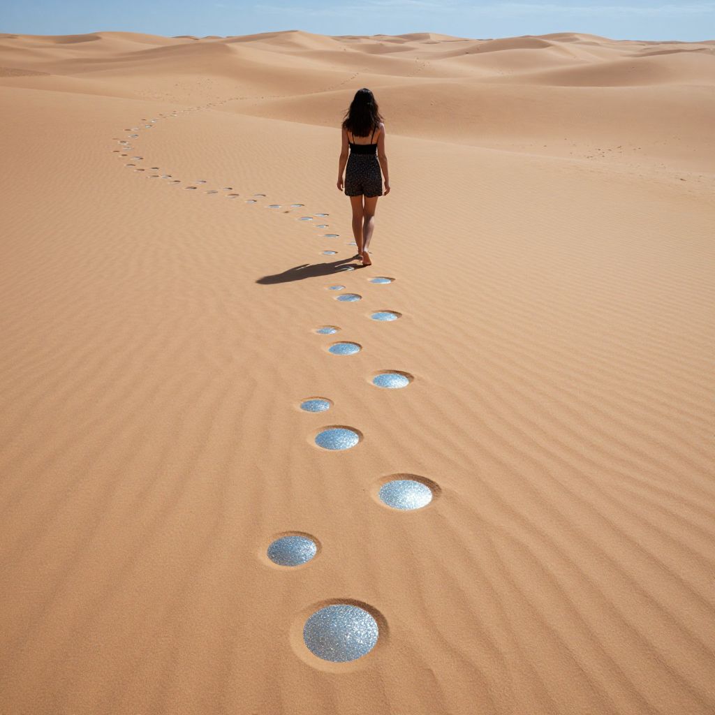 Woman walking through a surreal desert landscape, leaving a trail of perfectly circular footprints that reveal shimmering blue reflections, creating an illusion of infinite alternate paths stretching into the horizon.