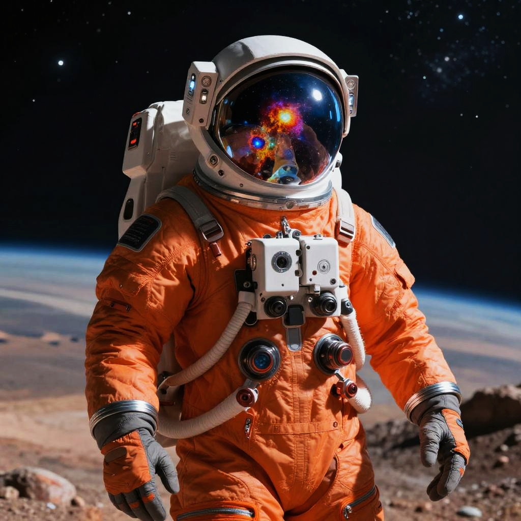Space suit orange futuristic astronaut exploring a distant alien planet, intricate details on the suit fabric, glowing visor reflecting vivid cosmic nebula, dramatic lighting with a starry background, high resolution sci-fi concept art