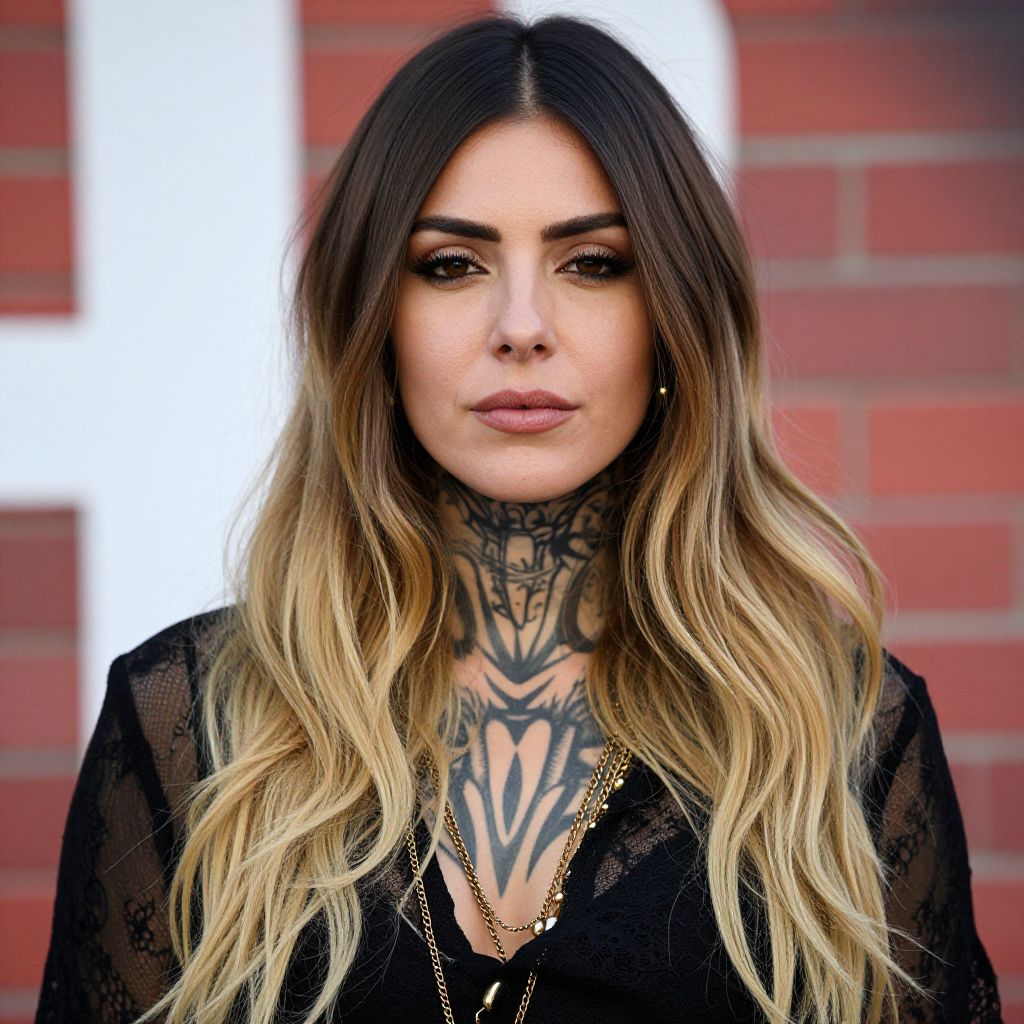 Photograph of a woman with long, wavy, ombre hair transitioning from dark brown to blonde. She has dark, intricate tattoos covering her neck and chest, wearing a black, semi-sheer lace top with gold jewelry. Her eyes are slightly squinted, and she's looking off-camera with a neutral expression. The background is blurred with red and white colors, possibly a brick wall.