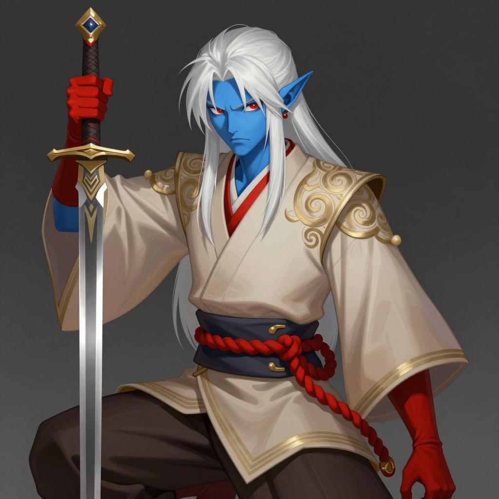 Digital illustration of a person with long, flowing white hair, wearing a white mask with red horns and black markings. The mask covers the upper face, leaving one eye visible with a serious expression. The person's right hand is near their mouth, with red-painted nails. A delicate chain with a blue gem hangs from the mask. Black and gray clothing with intricate patterns. Red petals float around the head. The background is dark.