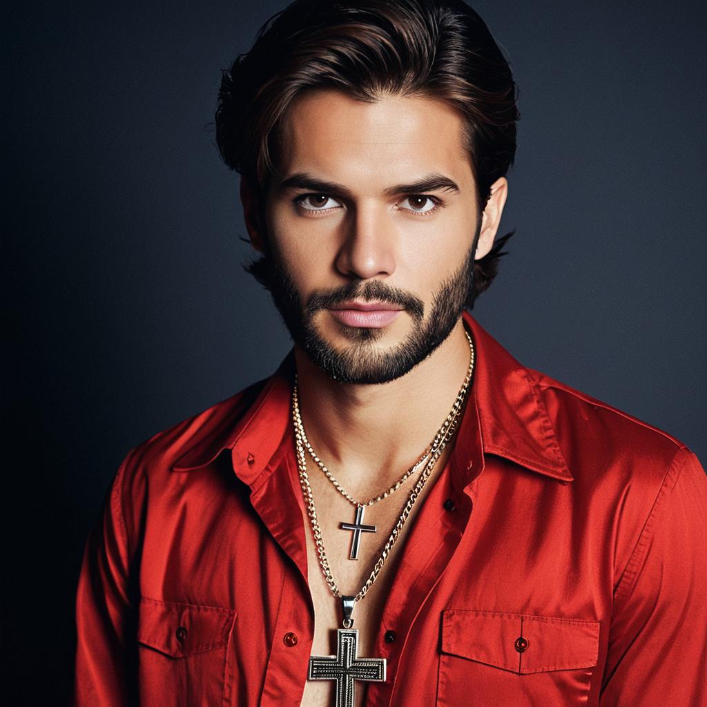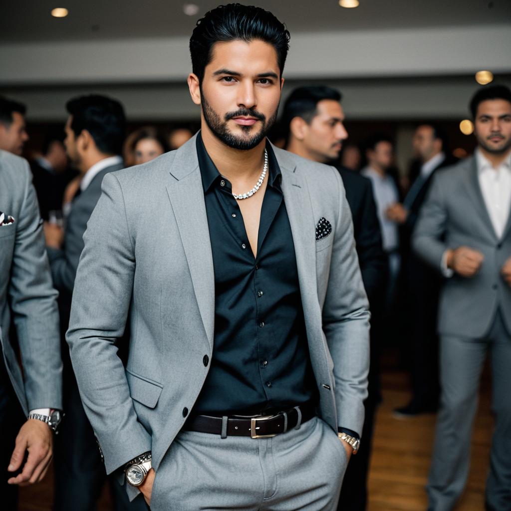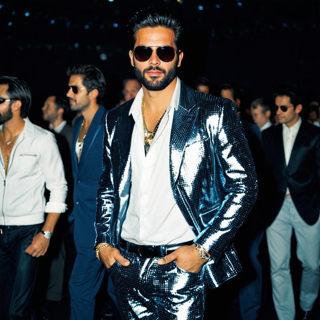 Neon party outfit man fancy,1boy, male focus, solo, open clothes, shirt, open shirt, black hair, jewelry, facial hair, realistic, necklace, looking at viewer, navel, green shirt, pants