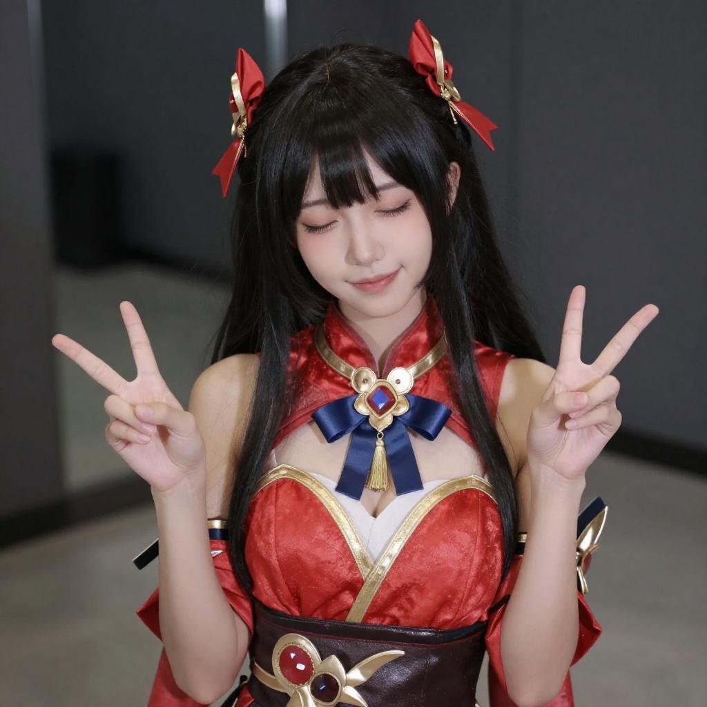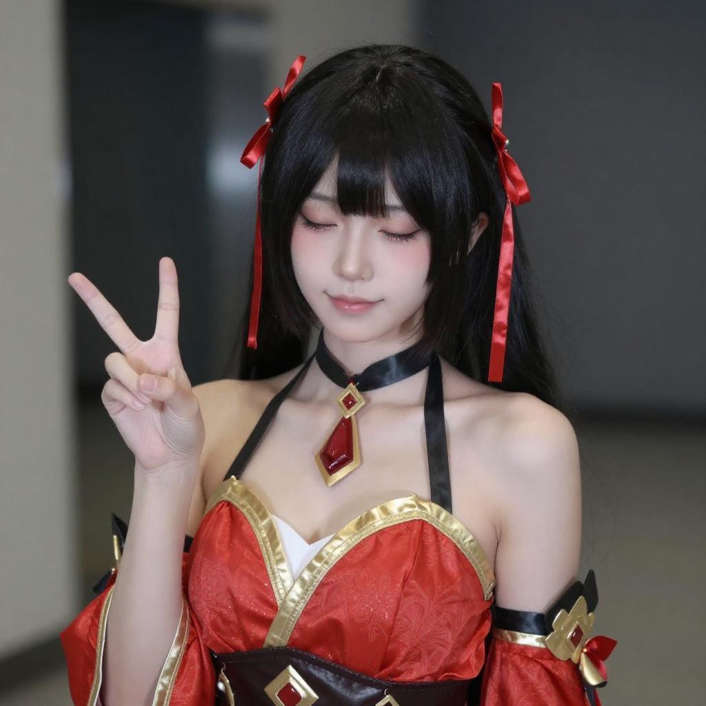 Photograph of an Asian woman with pale skin, black hair with red tips, and pink blush, cosplaying as a nude character with a white and red fox mask, red arm cuffs, and a black choker. She is sitting on a gray carpet, leaning forward with a playful expression, making a peace sign with her right hand.