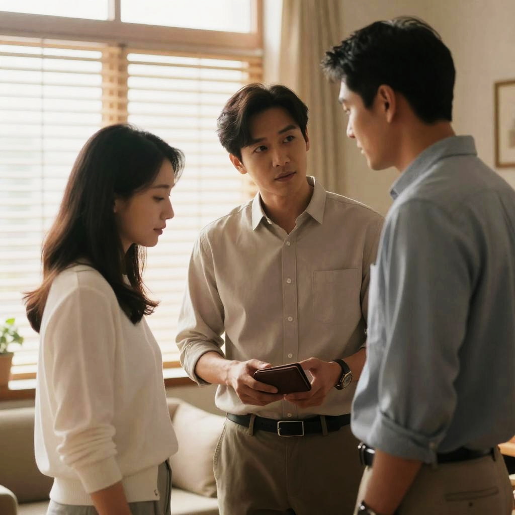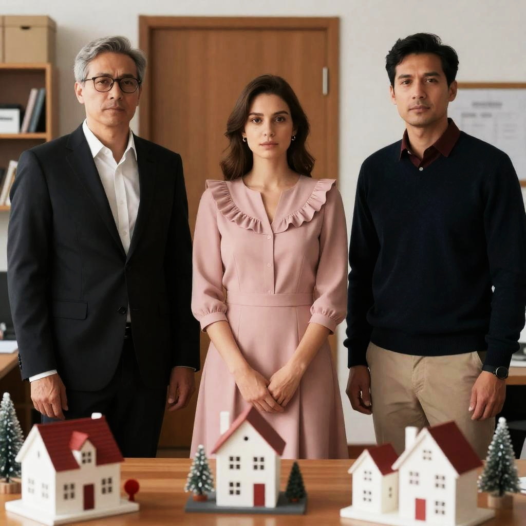 Photograph of a man and woman in a room with large columns and bookshelves. They are building a miniature town with small houses and buildings on a carpet. Man leans forward, woman stands beside him. Both have short dark hair. Man wears brown jacket, woman wears yellow dress. Background includes chandelier and armchair. Bright, indoor lighting.