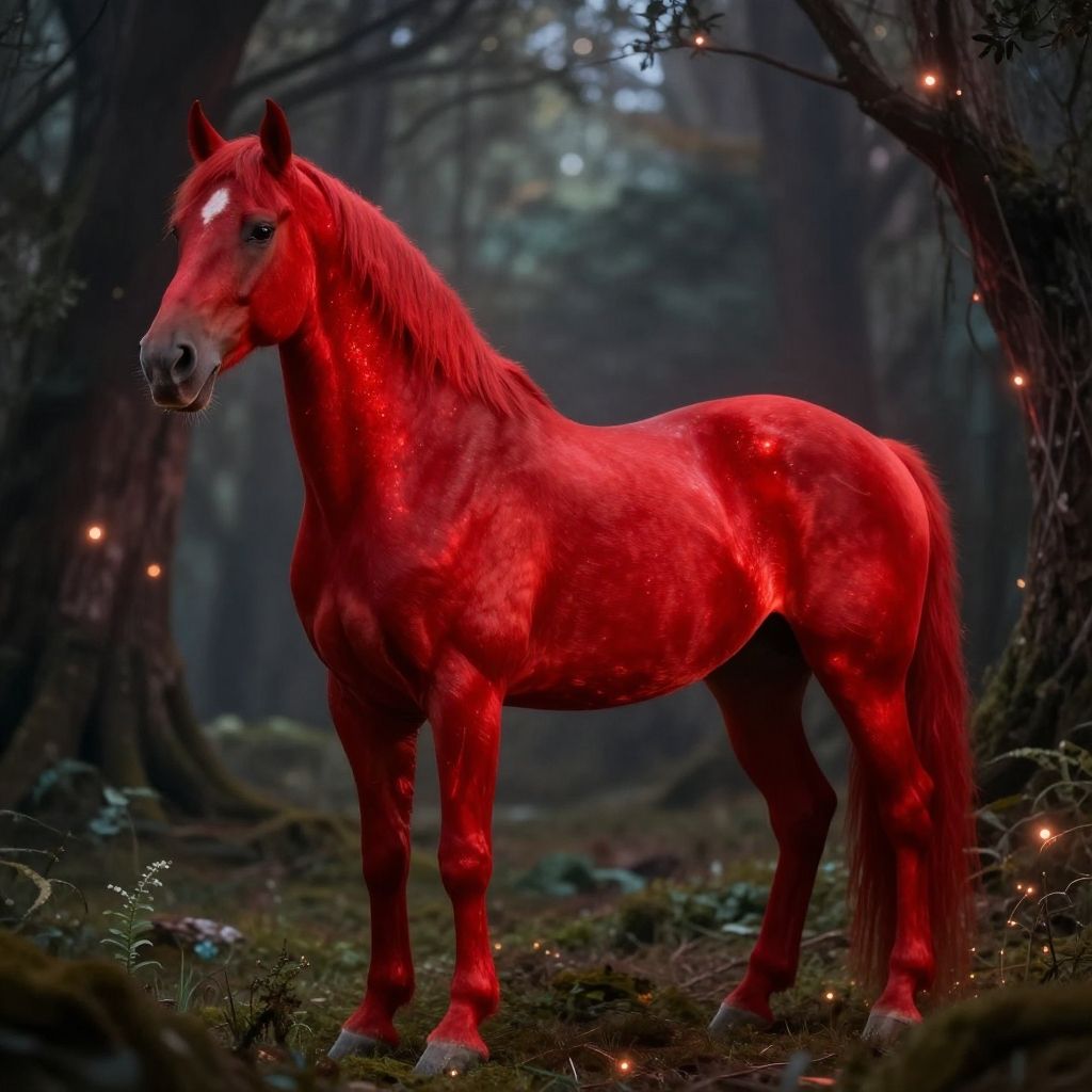 Beyonce red horse standing majestic in a mystical forest clearing, glowing red coat shimmering, ethereal atmosphere, magical realism, intricate textures, soft glowing lights