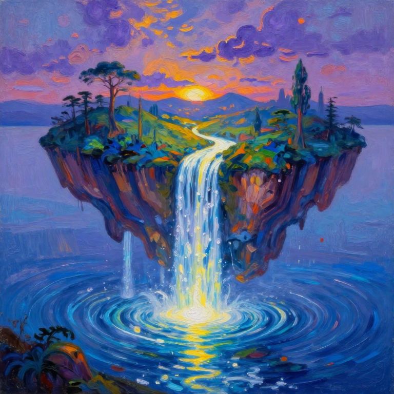 Art images to draw: A surreal landscape featuring floating islands with waterfalls cascading into a glowing radiant ocean under a twilight sky, painted in vibrant impressionist style with rich textures and dynamic brush strokes.