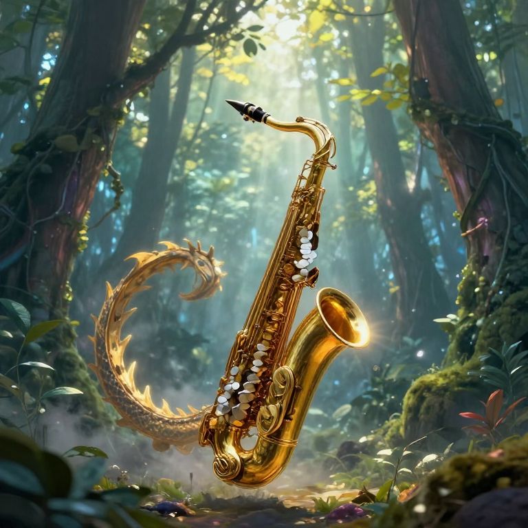 A vibrant, digital fantasy artwork depicts a golden, saxophone-shaped dragon with a serpentine body and a dragon head, adorned with glowing white spots. The dragon stands in a sunlit, enchanted forest, surrounded by lush green foliage and tall trees. Light filters through the canopy, creating a magical, ethereal glow. A small black bird perches on the dragon's curled horn. The saxophone has intricate golden details and a shiny, metallic sheen. The forest floor is scattered with small, colorful flowers, adding to the whimsical atmosphere. The image combines realistic textures with fantastical elements, creating a captivating, otherworldly scene.