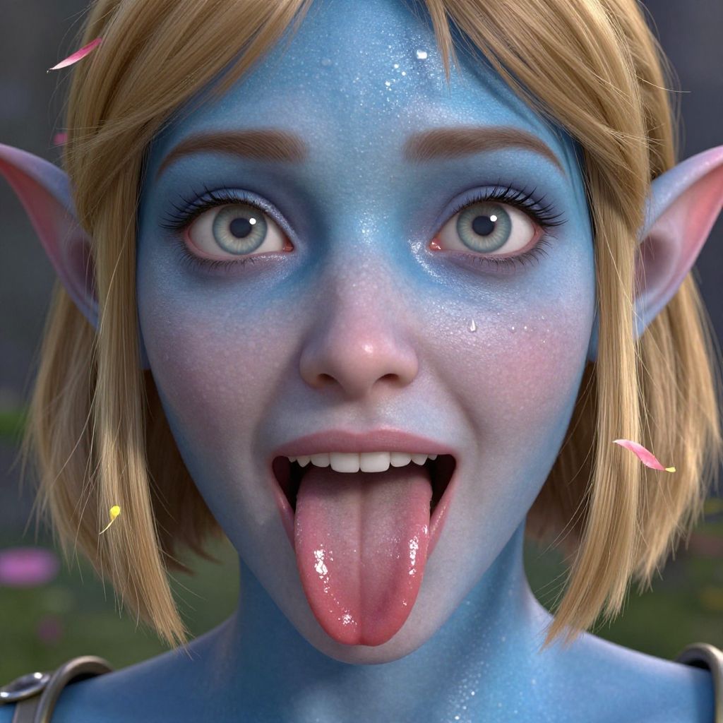 This is a hyper-realistic CGI image of a blue-skinned female elf with large, expressive green eyes and pointed ears. She has short, blonde hair with a few pink petals scattered in it. Her skin is glossy with a speckled texture, resembling small stars or freckles. She sticks out her long, shiny pink tongue, and her mouth is slightly open, revealing small, white teeth. The background is blurred, featuring dark green and pink hues, suggesting an outdoor setting with foliage. The lighting highlights her facial features and skin texture, giving a three-dimensional effect.