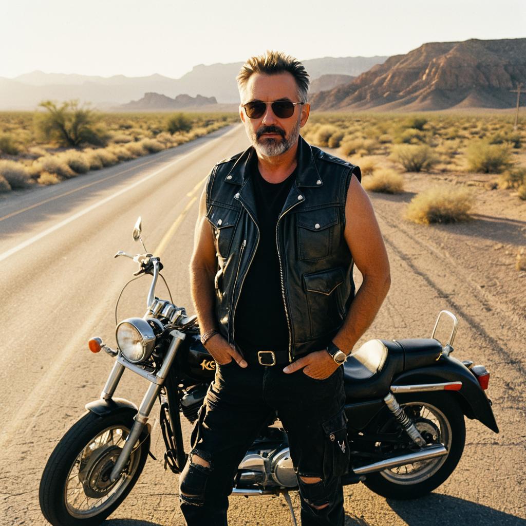 Photograph of a middle-aged biker with sunniest, distressed leather vest and black cargo pants, next to a desert highway at golden hour, confident and rebellious, cinematic film still, Kodak Portra, sassy and edgy vibe.