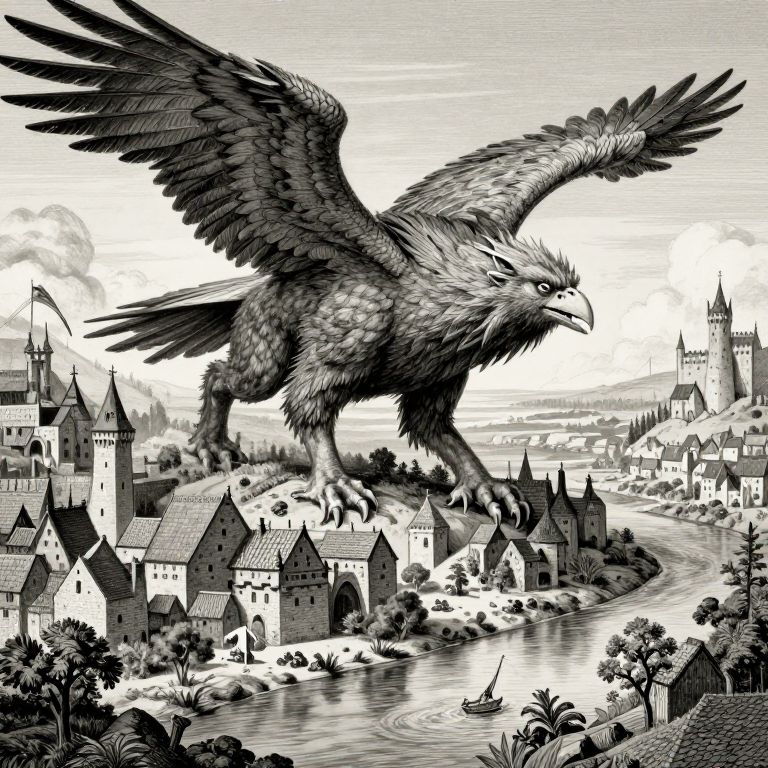Feathered Ogre Over Medieval Town