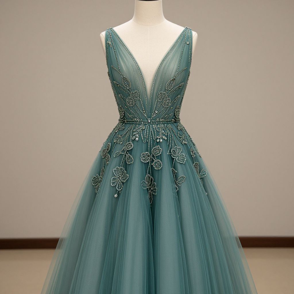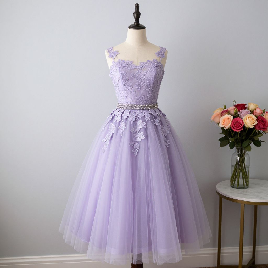 Elegant pink satin long prom dress featuring a round neck, short sleeves, and lace appliqué detailing elegantly draped over a mannequin against a neutral gray background.