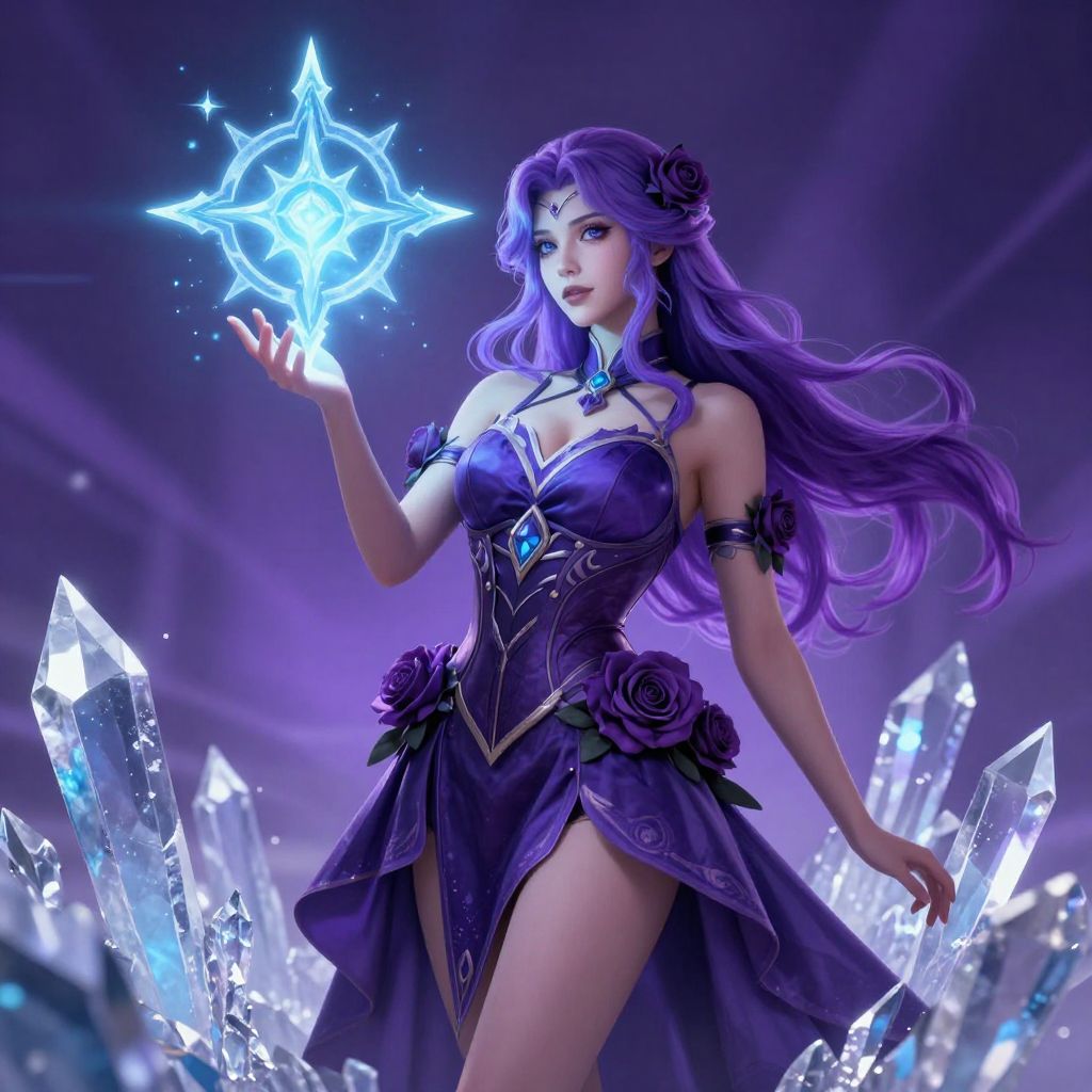 Digital artwork of a fantasy woman with long, flowing purple hair and fair skin, dressed in a revealing, dark purple, ornate dress adorned with black roses. She holds a glowing, blue, star-shaped magical orb in her right hand, while large, crystalline structures surround her in the background. The scene is bathed in a purple, ethereal light, highlighting her confident and mystical presence. Her dress features intricate gold and blue patterns, and she wears a blue gem necklace. The style is reminiscent of fantasy video game art.