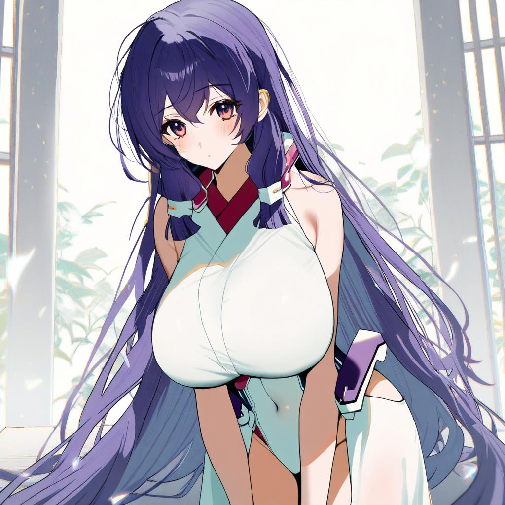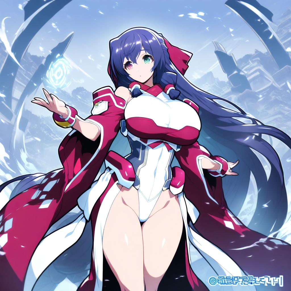 Asama tomo, kyoukaisenjou no horizon, 1girl, heterochromia, green eyes, red eyes, long hair, very long hair, purple hair, blue hair, large breasts, huge breasts, by artist shiwasu no okina, leet