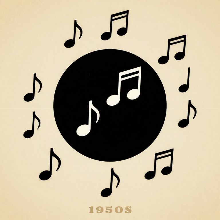 Black and white musical note illustration with central black circle, surrounded by various musical notes, on a beige background, labeled "1950s" at the