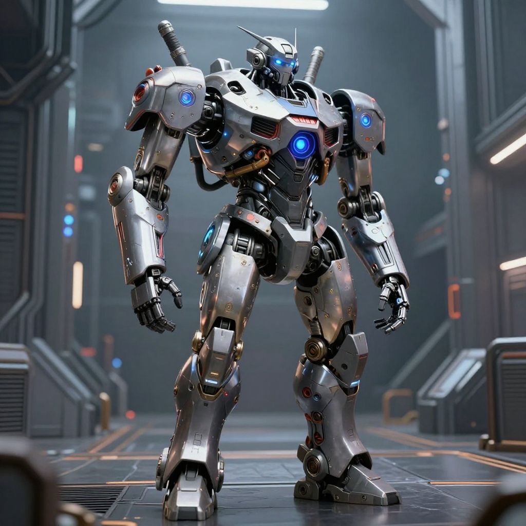 Photorealistic CGI of a towering silver robotic warrior standing in a futuristic, dimly lit industrial corridor. The robot has a sleek, metallic body with blue glowing eyes and accents, and intricate mechanical details. Its arms are raised slightly, with one fist clenched and the other relaxed. The background features metallic walls with illuminated panels, staircases, and a foggy atmosphere, enhancing the sci-fi ambiance. The robot's design is reminiscent of a Gundam or mecha style, with angular, armor-plated limbs and a menacing, yet elegant presence.